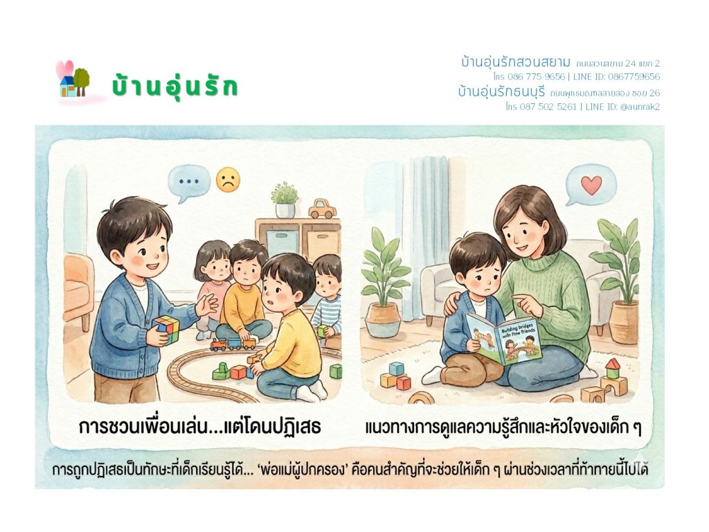 ในช่วงเวลาที่ท้าทายทางอารมณ์นี้เป็นเวลาที่ บ้านอุ่นรัก อยากชวนให้ผู้ปกครองช่วยดูแลความรู้สึกและหัวใจของเด็ก ๆ ตลอดจนช่วยนำทางให้พวกเขาเรียนรู้ว่า “การถูกปฏิเสธเป็นเรื่องที่เกิดขึ้นได้ + ลูกรับมือได้ + ลูกสามารถลองชวนเพื่อนเล่นด้วยใหม่ได้อีกในครั้งต่อ ๆ ไป”