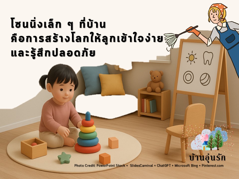 • จัดบ้านอย่างเป็นระบบ ลดเสียงดัง แสงจ้า และสิ่งรบกวน ลูกก็จะค่อย ๆ รู้สึกว่า “ที่นี่ปลอดภัย” และพร้อมเปิดใจเรียนรู้สิ่งใหม่ ๆ